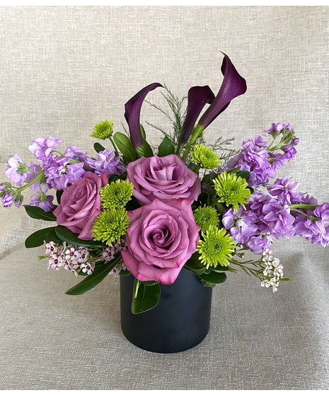 This unique bouquet features a black ceramic vase artistically filled with a unique color combination of flowers including calla lilies, roses, pom pom mums and stock.
