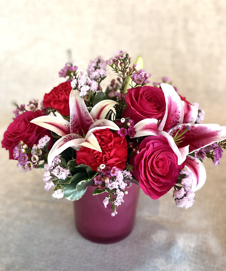 Pretty in pink! This magical bouquet absolutely glimmers! A premium pink glass vase is filled with a compact selection of fuchsia roses, carnations, and fragrant Rubrum lilies.