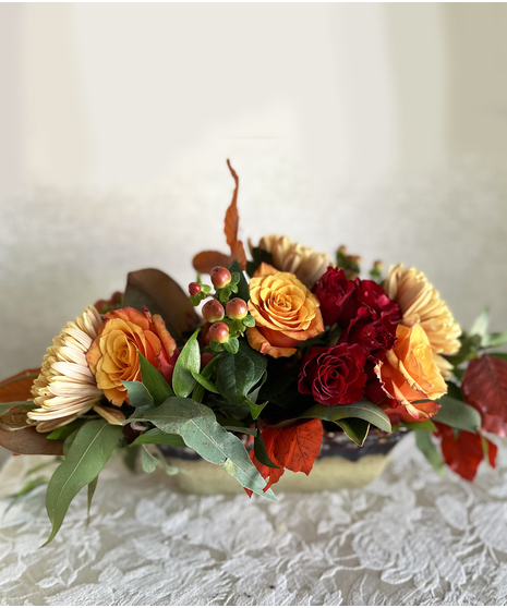 This beautiful bouquet is dessert for the eyes! Bring your dinner host this charming mix of fall colored roses, berries, chrysanthemums and fall leaves and you will be the favorite guest.