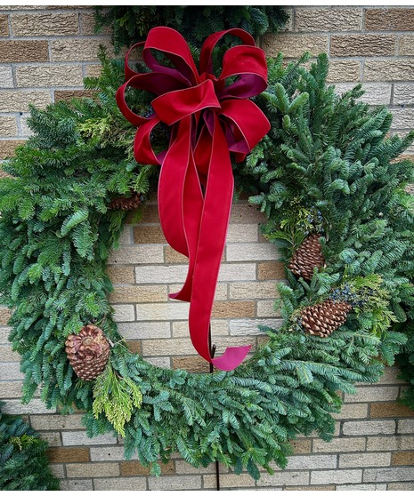 WOW! We just received a shipment of beautiful, fresh, fragrant wreaths that feature a mix of choice evergreen and are accented with pinecones and a designer bow if requested. Besides making a classic statement to your front door, hang one on your garage, and you'll be the envy of your neighborhood. Or, hang one in your business or office- inside or out and add instant Christmas cheer. Plus, a live wreath is a much-appreciated, long-lasting gift for friends and colleagues, as well as a tender touch for a loved one's gravesite during the Christmas season.