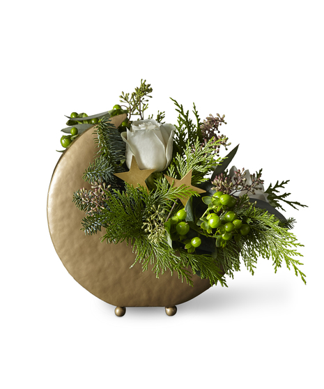 This enchanting moon and stars container is filled with evergreen, berries and roses.