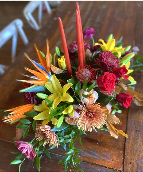 Glorious and Bountiful! Birds of paradise, pincushion protea, roses, all kinds of fall's favorite- chrysanthemums, lilies, and autumn leaves shout the glories and bounties of fall. This exquisite bouquet, which includes 3 taper candles, simply puts you in a grateful and celebratory place. Take a moment to sit back and enjoy this earth's beauties.