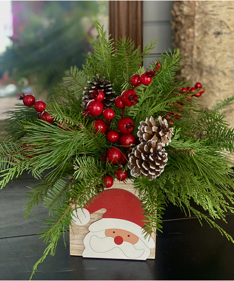 Send a bit of holly jolly with this whimsical wooden box featuring who else, but St. Nick, and filled with a mix of evergreen, berries and pinecones.