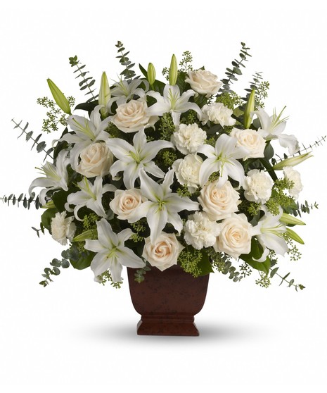 Lush and lovely, this arrangement features white roses, lilies, carnations and eucalyptus. Containers may vary. (Note: Arrangement will be filled with the highest quality, freshest flowers available to the value of the order and therefore flower substitutions may be necessary.)