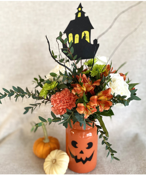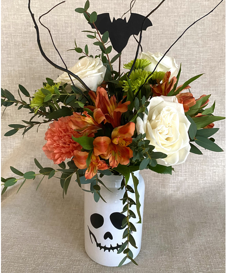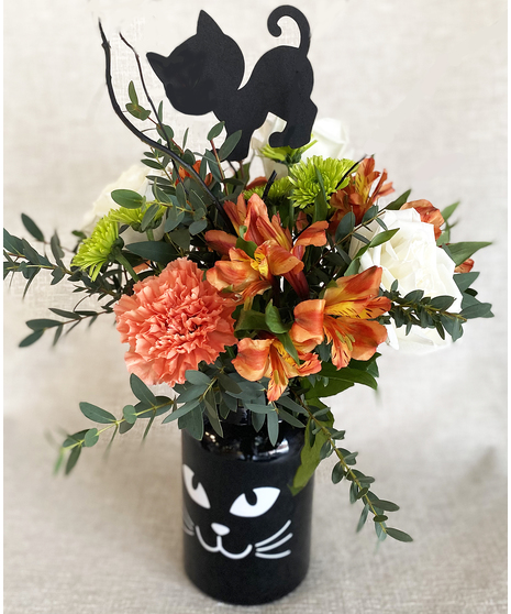 Such fun containers- choose between a pumpkin, ghost or cat for a special surprise bouquet that makes a great Halloween decoration for years to come! Your container is filled with orange alstroemeria and carnations, white roses, green pompon mums, greenery, curly willow, with a festive Halloween pick.