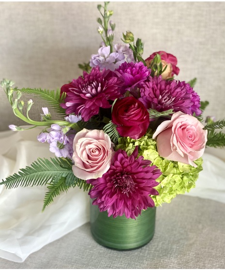 A gorgeous bouquet of ranunculus, hydrangeas, roses, stock and fuji mums in a cut glass, sculptural vase. Simply radiant! Just like mom.