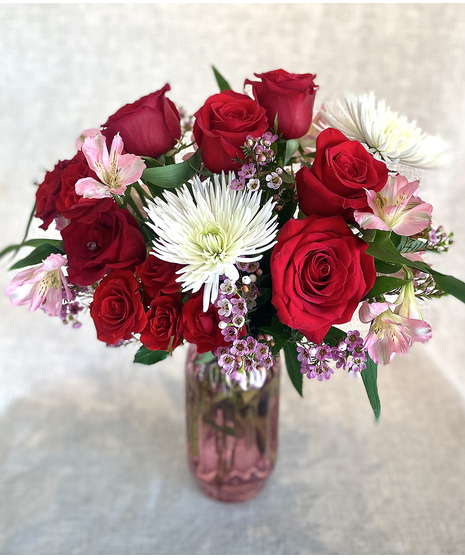 A gorgeous mix of velvet red standard and spray roses accented by white spider mums, alstroemeria lilies and wax flowers all artfully arranged in a pink amethyst glass vase.