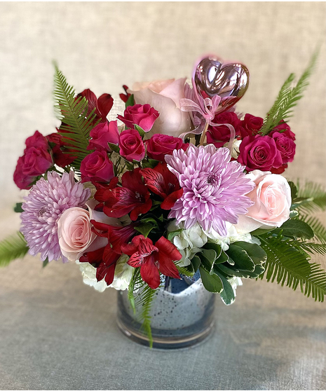 This is a one-of-a-kind arrangement! It's an artistic mix of roses, spray roses, hydrangeas, mums, alstromeria lilies and ferns. But what really makes this bouquet shine is the exquisite silver mercury glass vase and yes, it's even accented with a shiny silver pink heart. Your recipient will enjoy this gorgeous keepsake vase for future arrangements, as well as candle holder, desk accessory, hair and make up organizer...the list goes on...
