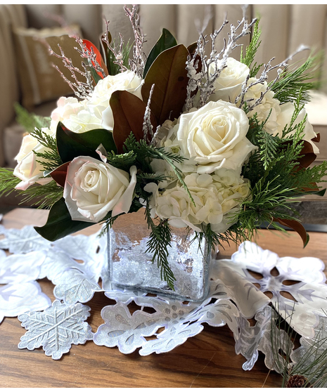 A gorgeous combination of white flowers including hydrangeas and roses in a vase. Vase may vary between square and round. Because of seasonality and product availability, your arrangement may vary from what is shown, but will be filled to value with the freshest and highest quality, long-lasting flowers available. VASE MAY VARY,