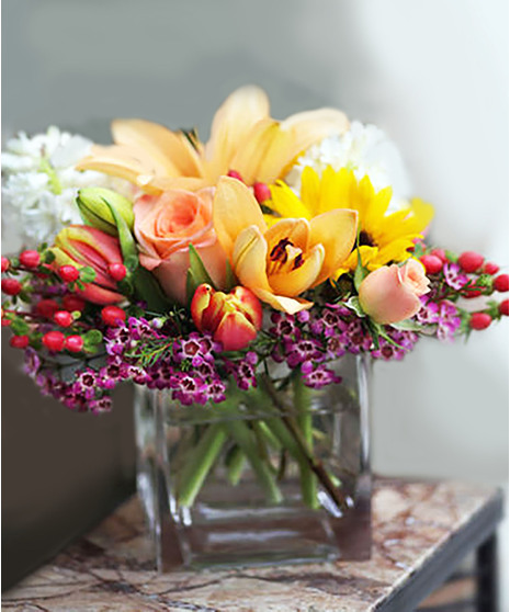 Revel in the beauty of spring, with our "Essence of Spring" bouquet featuring Lilies, Tulips, Roses, a Sunflower, Hypericum Berries and Wax flower. Clustered design in a cubed vase. May substitute some of the flowers due to availability to ensure the freshest quality.